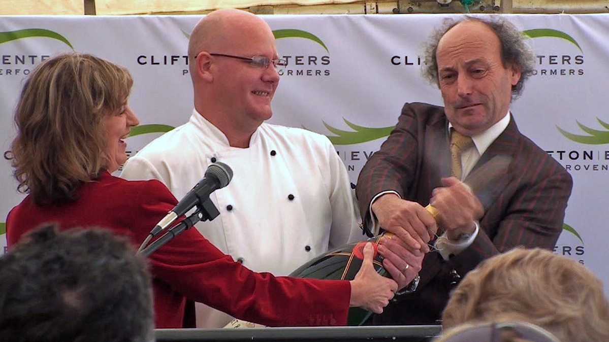 Frances Stead, Founder of Clifton Eventers, with chef Adam Dickson and husband Russell Hall at the official opening of the Clifton Eventers training facility, 16 October 2009